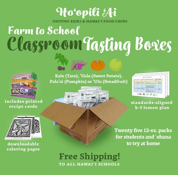 Student taste-tests made easy! The Farm-to-School Classroom Box contains 25 individual bags of your choice of locally grown or made products for students and ʻohana to try at home. Current options include frozen ʻulu, kalo, palaʻai or ʻuala, and shelf-stable ʻulu flour, pancake mix or animal crackers.  Boxes also come with 25 Keiki Cooking Guide cards providing easy and quick preparation instructions.