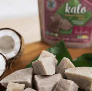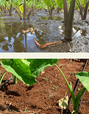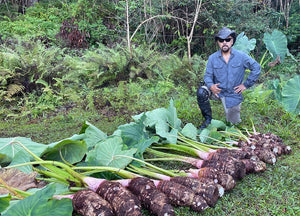 For over one thousand years, lo’i (wetland taro patches) covered the hillsides and valleys of Hawaiʻi, with at least 300 unique Hawaiian taro varieties in cultivation. In this production method, huli (a leaf stalk with part of the corm, or root, still attached) is planted in muddy patches where freshwater flows. This method can take 6-12 months to produce. During this time the loʻi must be weeded regularly. Wetland taro is usually made into poi or paʻiʻai.