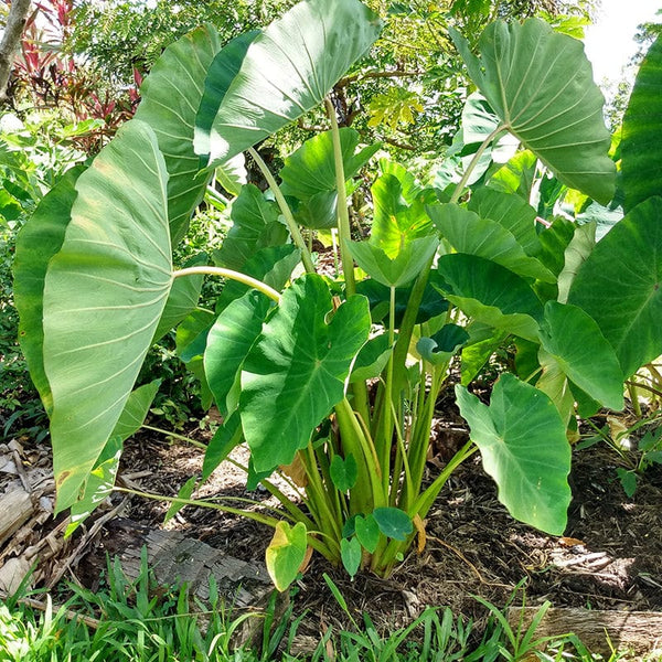 The second production method is upland farming, where the huli is planted into mounds of soil in mālaʻai (gardens or farms) and relies on rainfall and continuous mulching to grow. This method takes about 8-12 months to produce taro ready for harvest, and is often used primarily for the production of leaves. Upland taro corm is usually prepared steamed or baked and sliced into large chunks to serve.