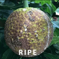 Ripe– As ‘ulu ripens it becomes soft and sweet and can be eaten raw or used in desserts and baked goods. Ripe ‘ulu has hints of sweet potato, banana, and pineapple flavors.