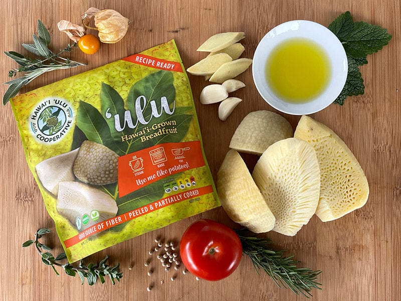 We offer recipe-ready ‘ulu and co-crops such as kalo, ‘uala and pala‘ai, as well as value-added ‘ulu products like hummus, chocolate mousse, and flour.